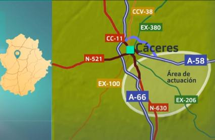 La autovía A-58 finaliza actualmente en las proximidades del casco urbano de la capital cacereña, en la zona del campus universitario, y para darle continuidad, el Ministerio y la Junta suscribieron el pasado abril un acuerdo sobre el cambio de titularidad de la carretera autonómica EX-100, de Cáceres a Badajoz, a favor de Fomento.